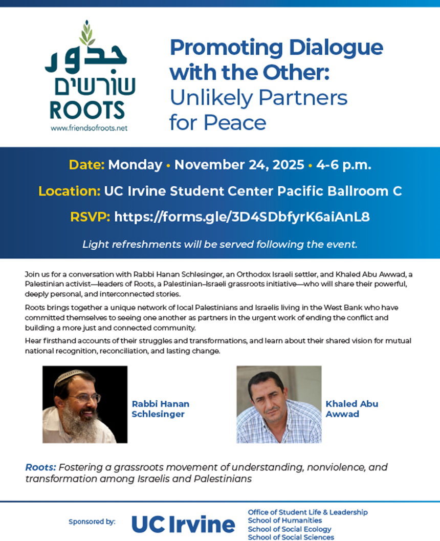 Roots and the co-sponsoring UC Irvine Office of Student Life & Leadership and the schools of Humanities, Social Ecology and Social Sciences present a conversation with Rabbi Hanan Schlesinger, an Orthodox Israeli settler, and Khaled Abu Awwad, a Palestinian activist, who will share their powerful, deeply personal and interconnected stories.